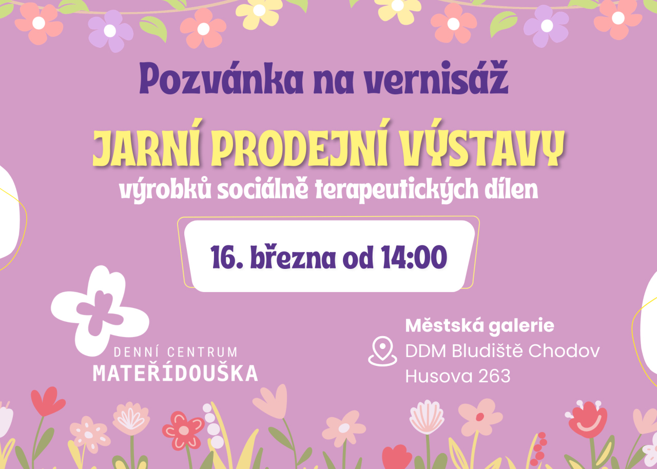 Rádi bychom Vás tímto pozvali na vernisáž Jarní prodejní výstavy výrobků sociálně terapeutických dílen, které pořádá Denní centrum Mateřídouška.